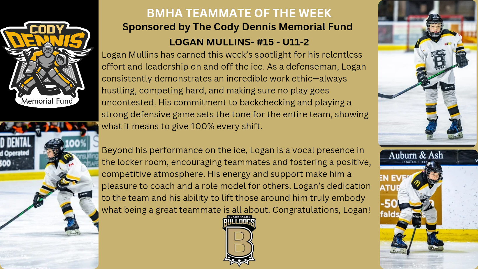 Let's give a BIG Bulldog celly for Logan Mullins from theU11-2 Team for being selected as the BMHA Teammate of the Week for the ...