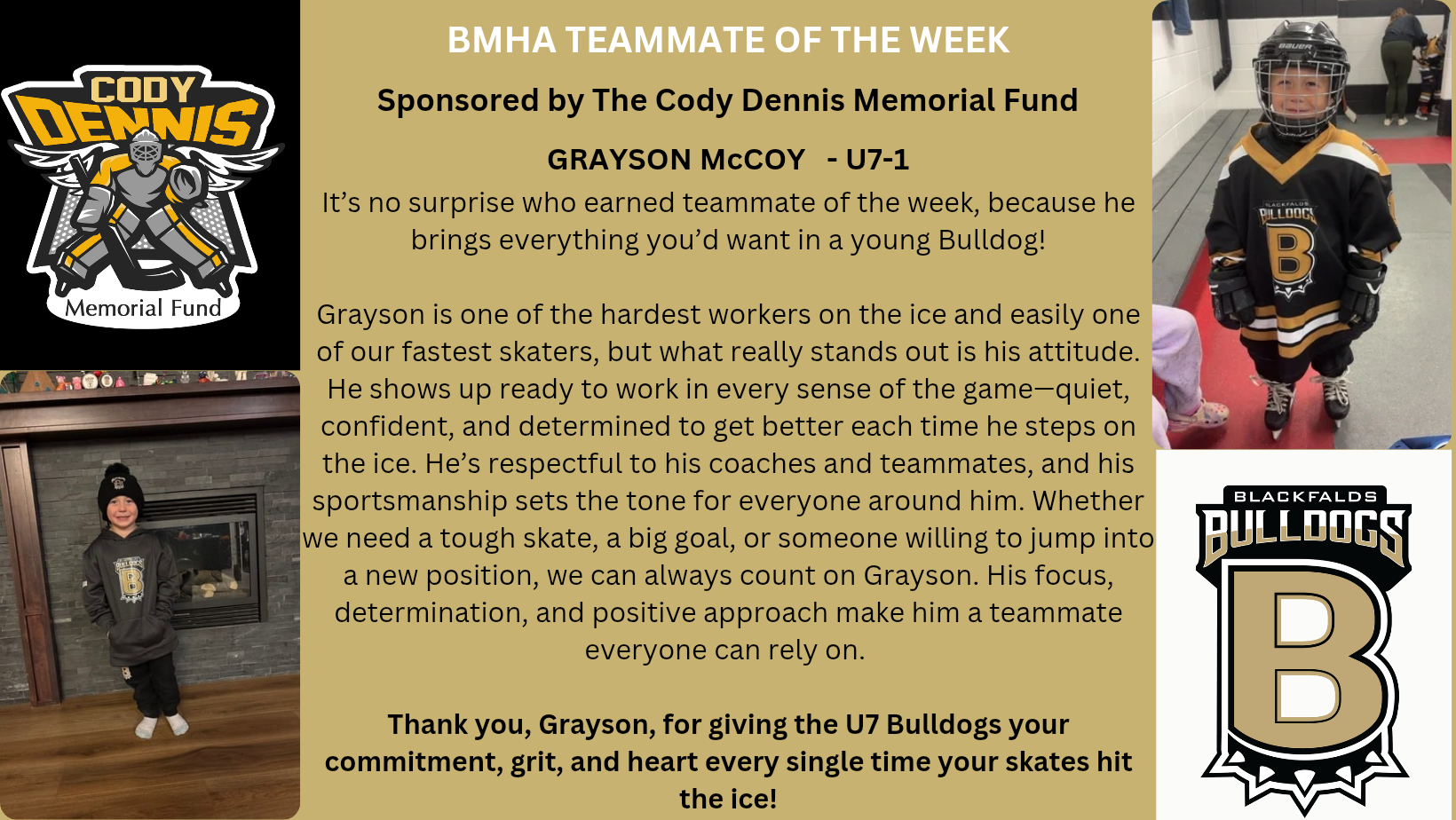 Teammate of the Week - November 30 Let's give a BIG Bulldog celly for Zayd Slepica from the U7-2 Team for being selected as the BMHA Teammate of the Week for the ...